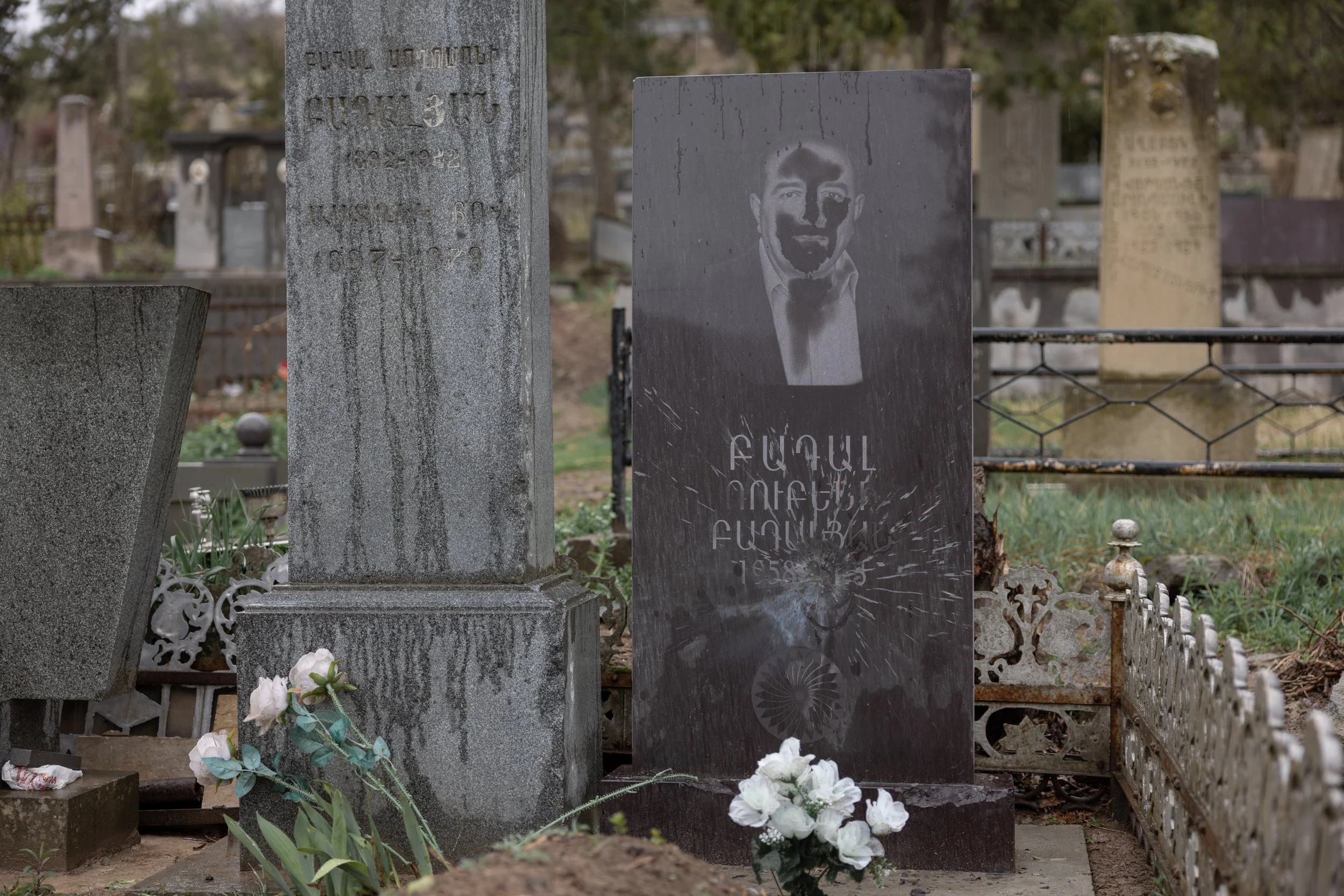 Damage is visible to one of several graves in the cemetery of Movses, Armenia on 6 April 2024 following overnight gunfire reported by local residents and authorities. According to locals, Azerbaijani military positions opened fire beginning late at night 5 April and continuing until approximately the early morning hours of 6 April, marking the first such incident affecting the village since July 2020.