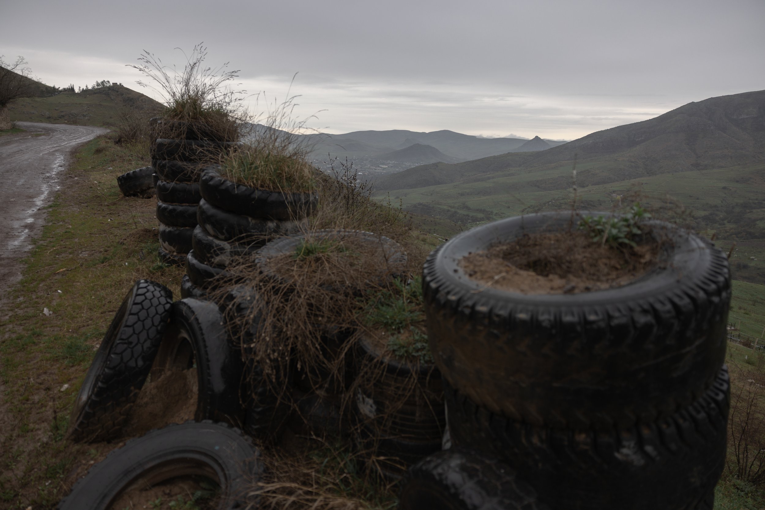A makeshift wall of tires lines the road between Movses and Aygepar to provide cover for vehicles from gunfire from Azerbaijani positions toward Movses on 6 April 2024 amid heightened tensions during border delimitation talks following the 2023 Nagorno-Karabakh exodus. In the distance the village of Alibeyli, Azerbaijan is visible only a few kilometers away.