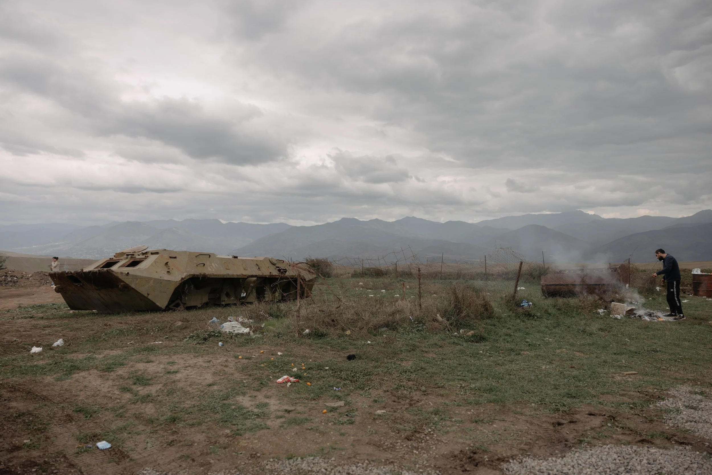 A recently displaced resident of Nagorno-Karabakh burns personal belongings and trash near a battered and abandoned Soviet BTR personnel carrier on the border with Azerbaijan outside Kornidzor in Syunik Province, Armenia on 26 September 2023 during the mass exodus of ethnic Armenians following Azerbaijan’s military offensive in September 2023 that forced over 100,000 people to leave their homes.