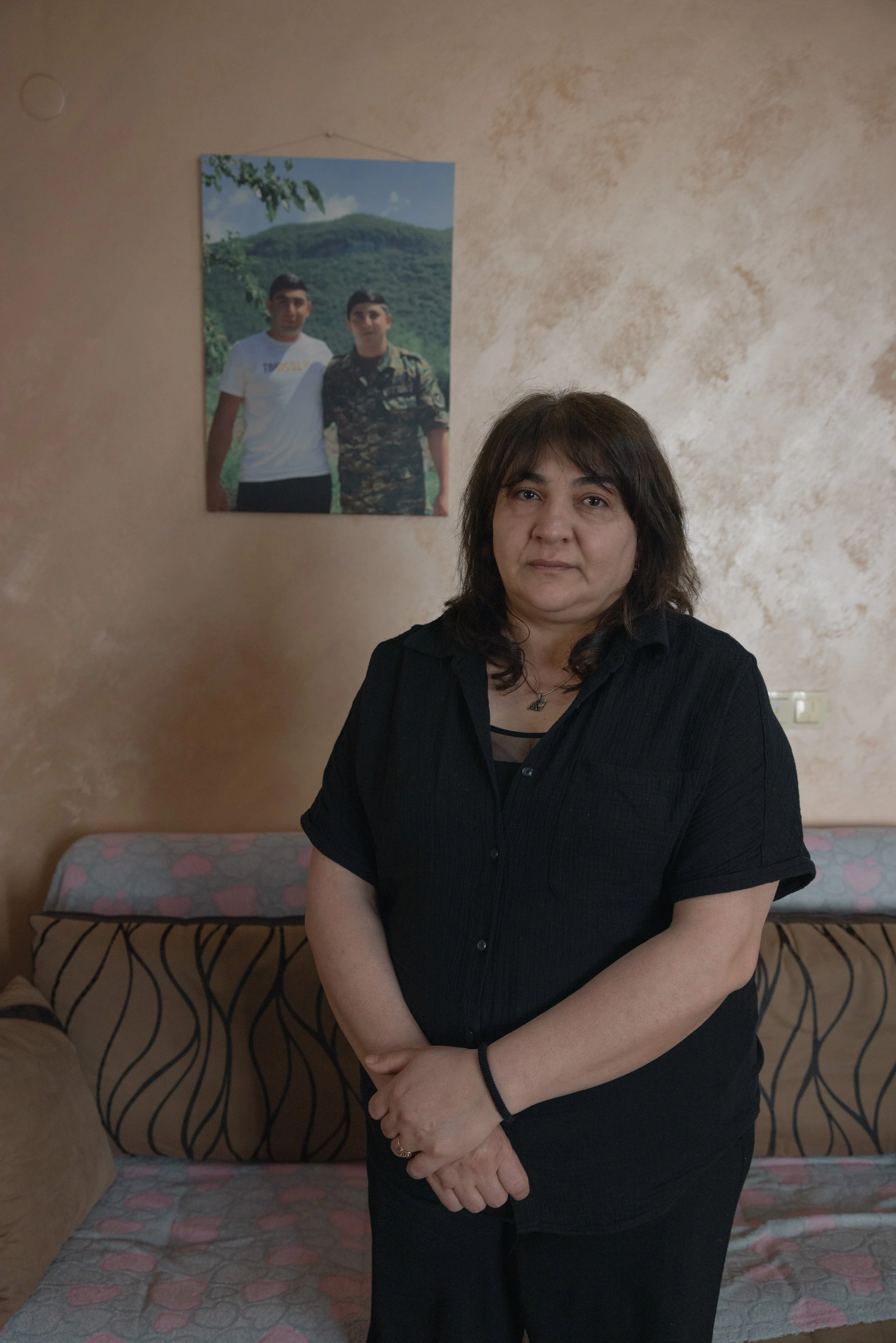 Irina Mirzoyan stands in front of a photograph of her sons inside her home in Yerevan, Armenia, on 26 March 2025. Her middle son, Arman, 18, was the first confirmed fatality in the Martakert region during Azerbaijan’s military offensive on Nagorno-Karabakh on 19 September 2023. He was killed while defending Armenian positions near the village of Magavuz.