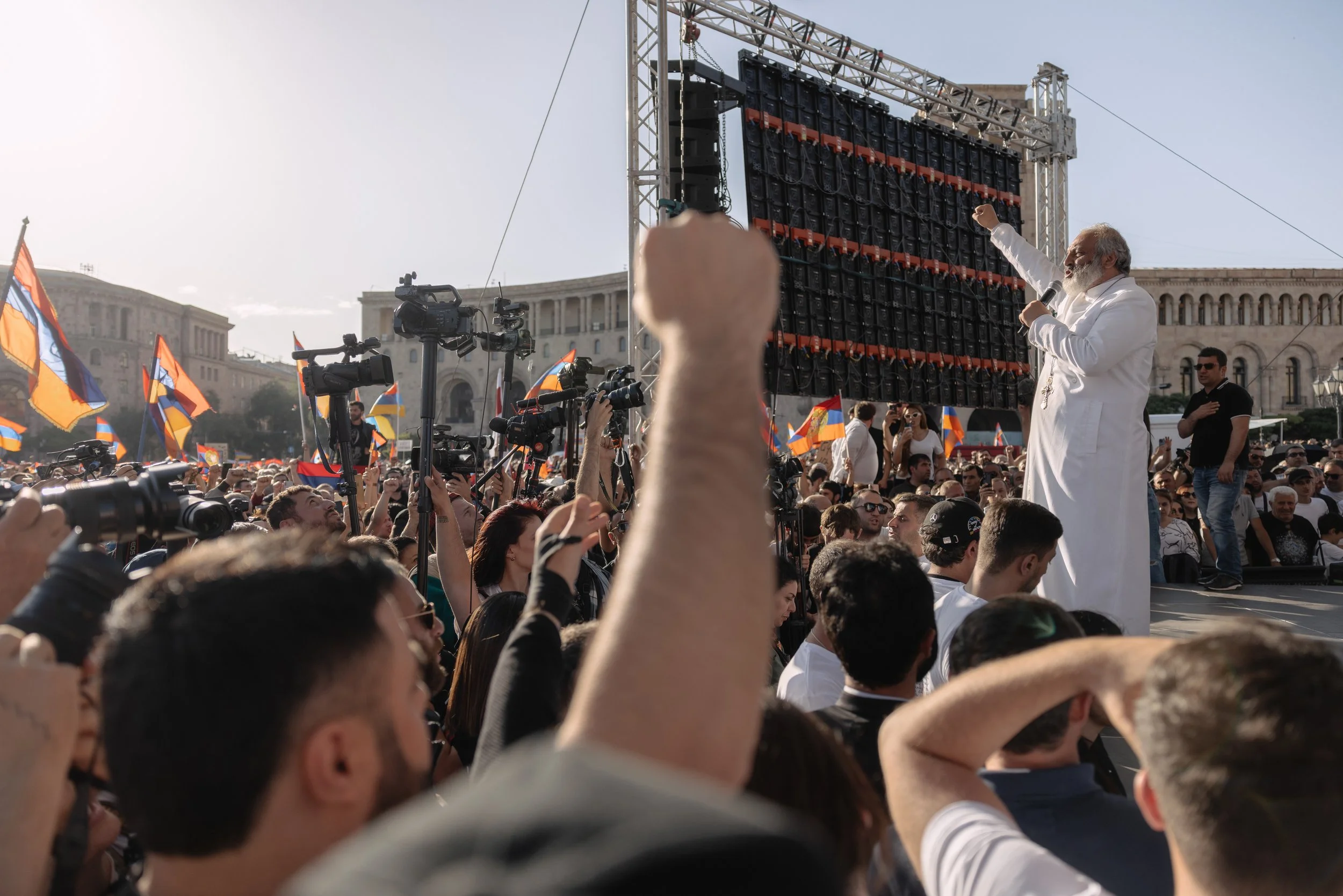 Archbishop Bagrat Galstanyan, Primate of the Tavush Diocese of the Armenian Apostolic Church, addresses protesters during a rally in Republic Square in the center of Yerevan, Armenia on 9 May 2024 as part of a movement initially known as “Tavush for the Homeland.” The protests began in May as a march from the Tavush border region to the capital, driven by public opposition to the Armenian government’s border delimitation and demarcation process with Azerbaijan, including the planned transfer of four villages near Tavush that had remained under Armenian control since the First Nagorno-Karabakh War.