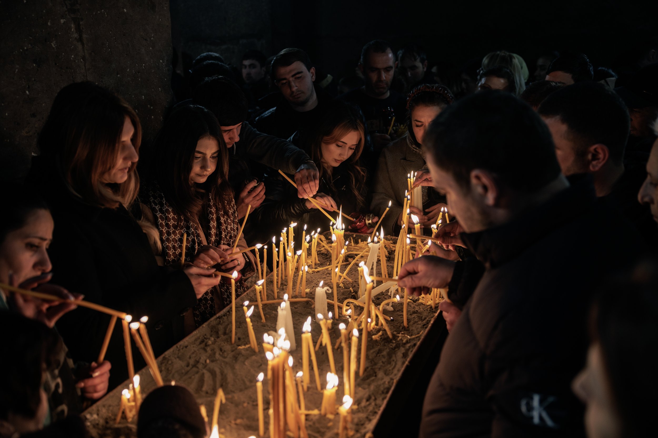Armenians displaced from Nagorno-Karabakh light candles and pray inside Saint Gayane Church during the Christmas Eve Candlelight Divine Liturgy on 5 January 2024 in Etchmiadzin, Armenia,marking the first time the Diocese from Nagorno-Karabakh, also known as Artsakh, held the service in Armenia following the September 2023 mass displacement and the ongoing Armenia–Azerbaijan border delimitation talks.