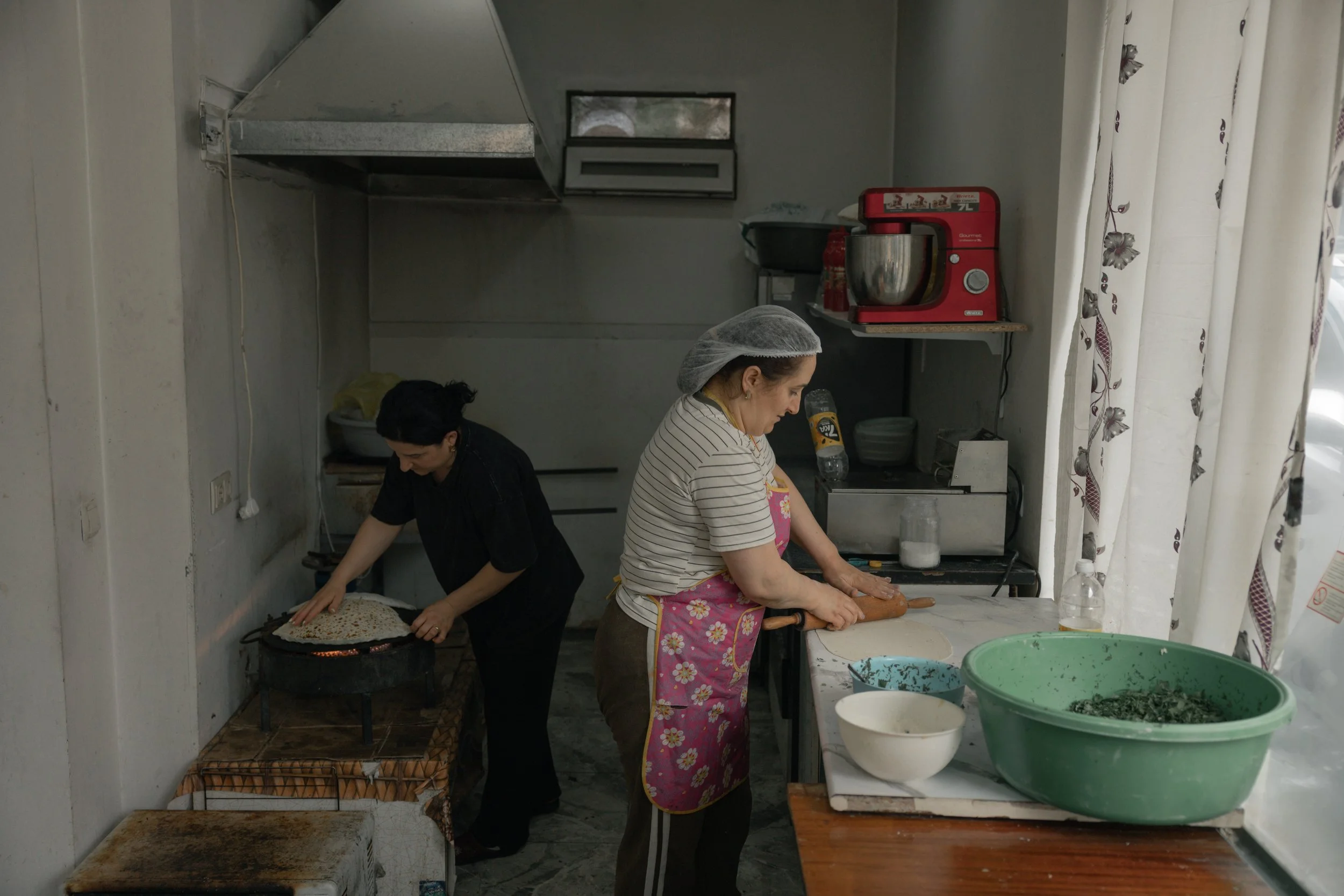 Mrs. Anna (right) and Gohar (left), originally from the Nagorno-Karabakh villages of Khndziristan and Drmbo, work in a small bakery in Kapan, Armenia, preparing zhingyalov hats and pakhlava, traditional Armenian pastries, on 19 May 2025. Forced to flee their homes after Azerbaijan’s 2023 military offensive, which emptied the region of its Armenian population, they resettled in southern Armenia near the border. Through their bakery, which employs local residents, they preserve cultural traditions while rebuilding their lives and livelihoods.