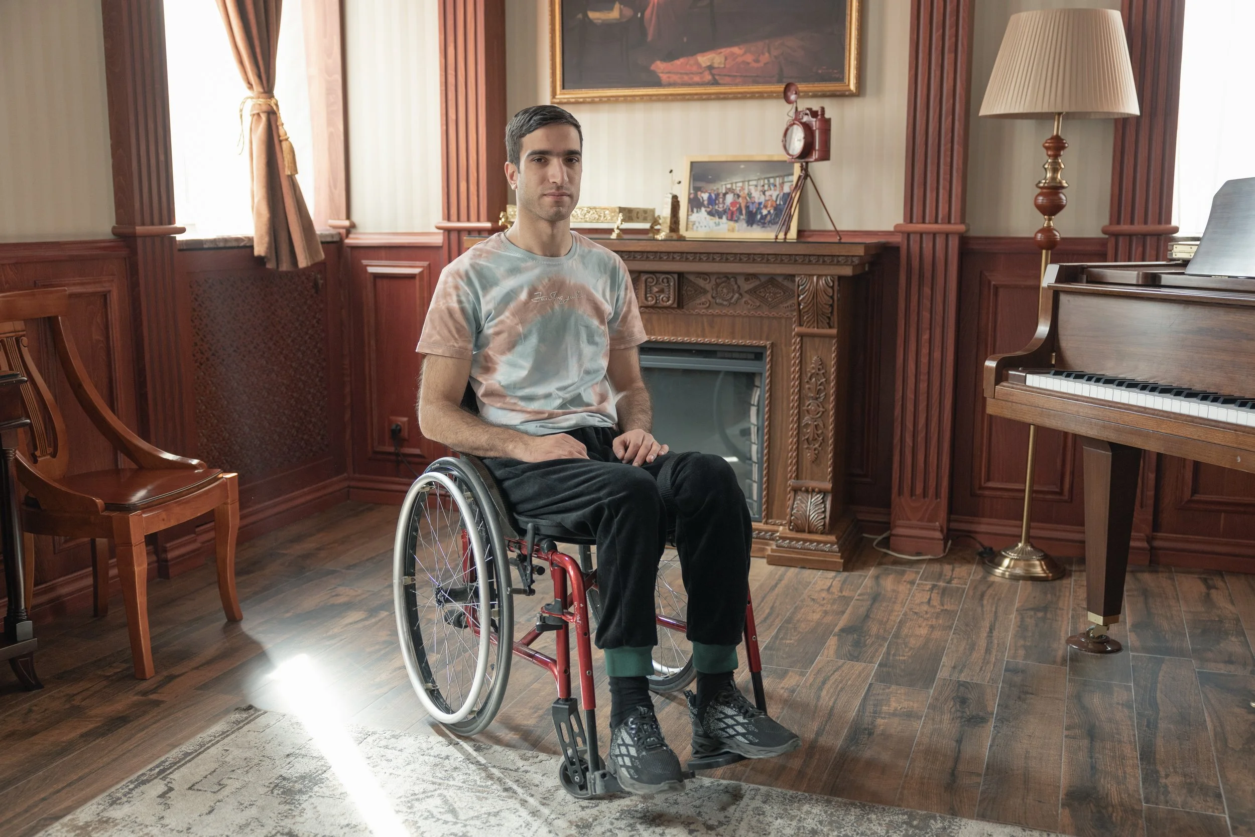 Portrait of a young wounded veteran, Hayk Zhamkochyan, at the Zinvori Tun Rehabilitation Center in Yerevan, Armenia on 1 March 2022 where he continues his recovery after being paralyzed by sniper fire during the 2020 Nagorno-Karabakh war. Zhamkochyan was among a large number of Armenian soldiers who were very young men, many just 18 or 19 years old when they were deployed during the 44-day conflict between Armenian and Azerbaijani forces in late 2020.