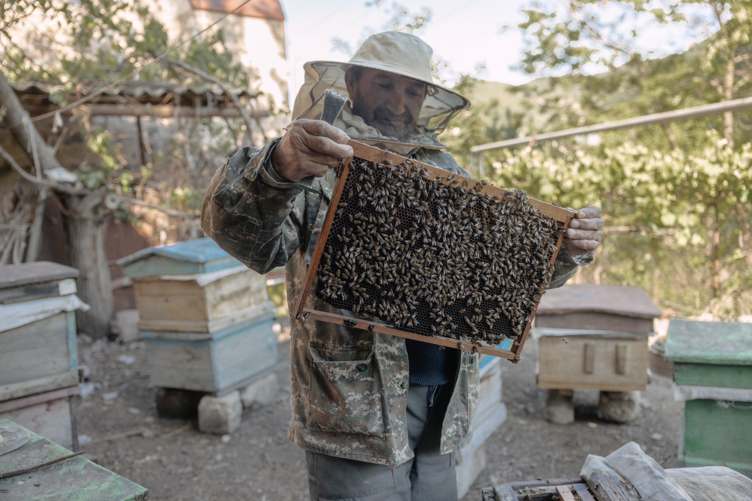 Liparit Martirosyan, 65, tends to his beehives next to his home in the border village of Khnatsakh, Syunik Province, Armenia, on 16 May 2025. Beekeeping provides honey for household use and limited income and has long been part of the region’s rural economy, where wild mountain flora produces prized local honey.