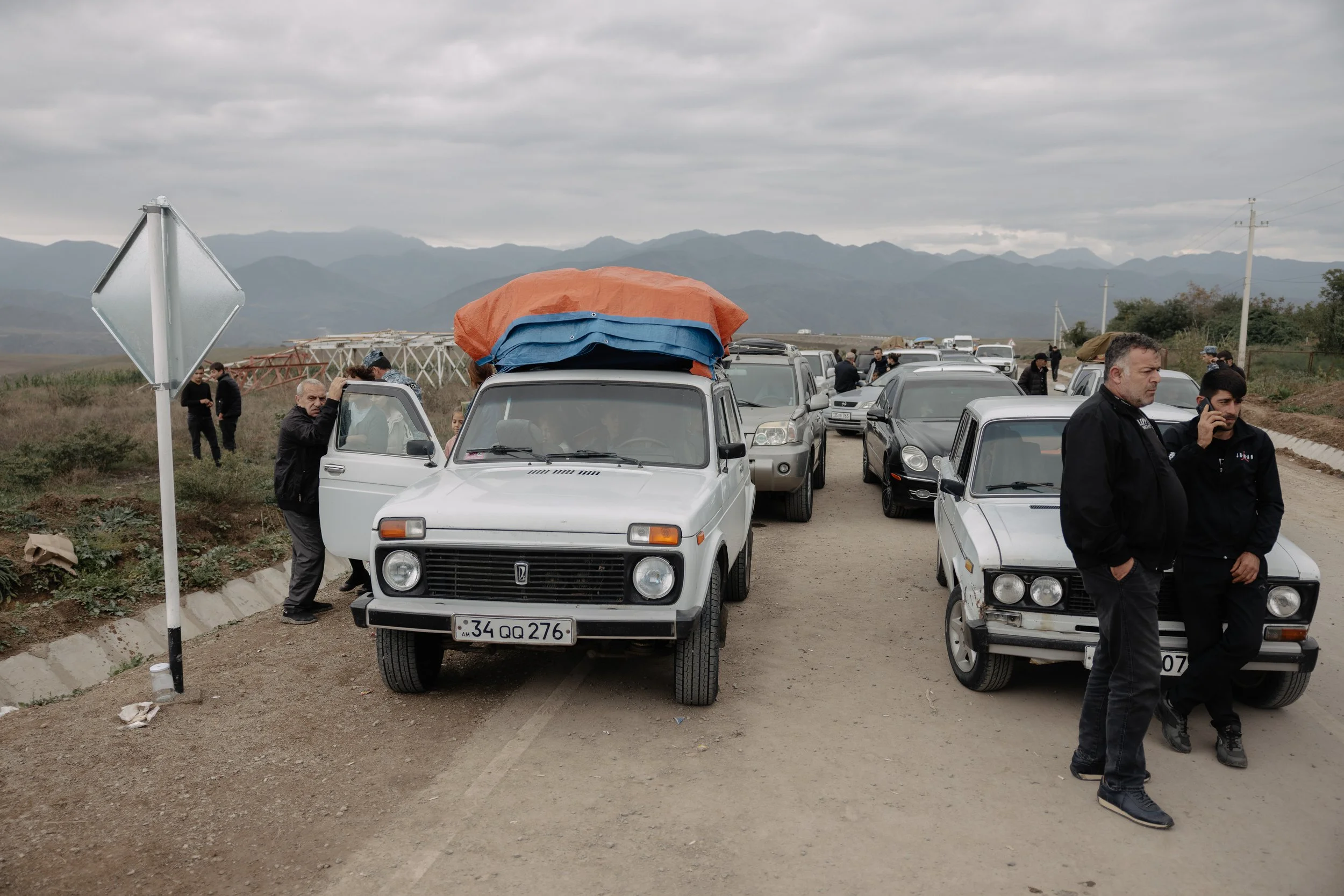Civilians with their personal vehicles wait to cross into Kornidzor, Armenia on 26 September 2023 with the mountains of Nagorno-Karabakh visible behind them, having endured days in traffic at the Lachin Corridor and Hakari Bridge following Azerbaijan’s offensive to retake Nagorno-Karabakh on 19–20 September 2023.
