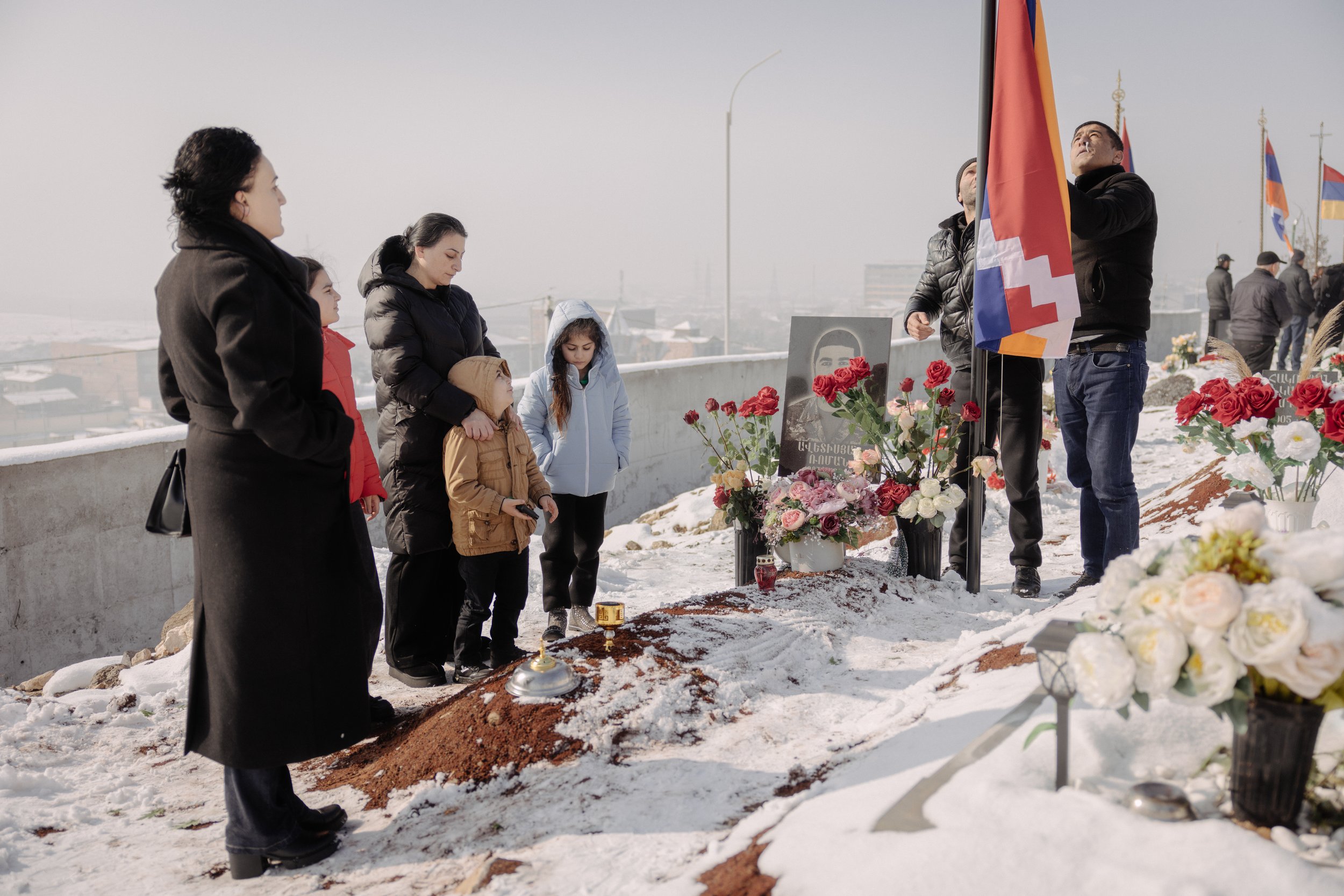 On 28 January 2024, a family gathers at the grave of their father at Yerablur Military Memorial Cemetery in Yerevan, Armenia, one of many victims of the 2023 conflict in Nagorno-Karabakh. In September 2023, a swift military offensive by Azerbaijan against Nagorno‑Karabakh triggered a mass exodus of ethnic Armenians, with more than 100,000 people forced to flee their homes and ancestral lands.