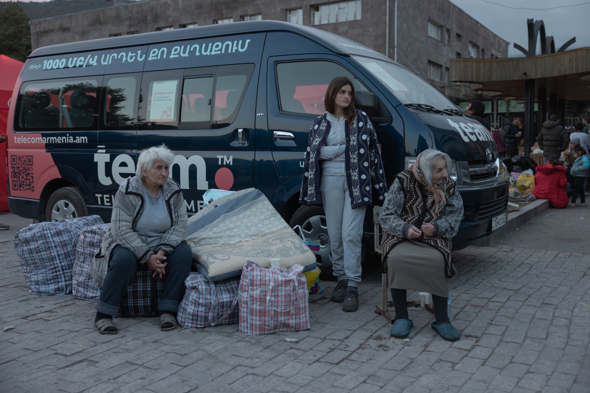 Forcibly displaced Armenians from Nagorno-Karabakh arrive in Goris, Armenia on 26 September 2023 with their personal belongings after crossing the Hakari Bridge along the Lachin Corridor following Azerbaijan’s military offensive on the region on 19–20 September leading to the displacement of over 100,000 ethnic Armenians.