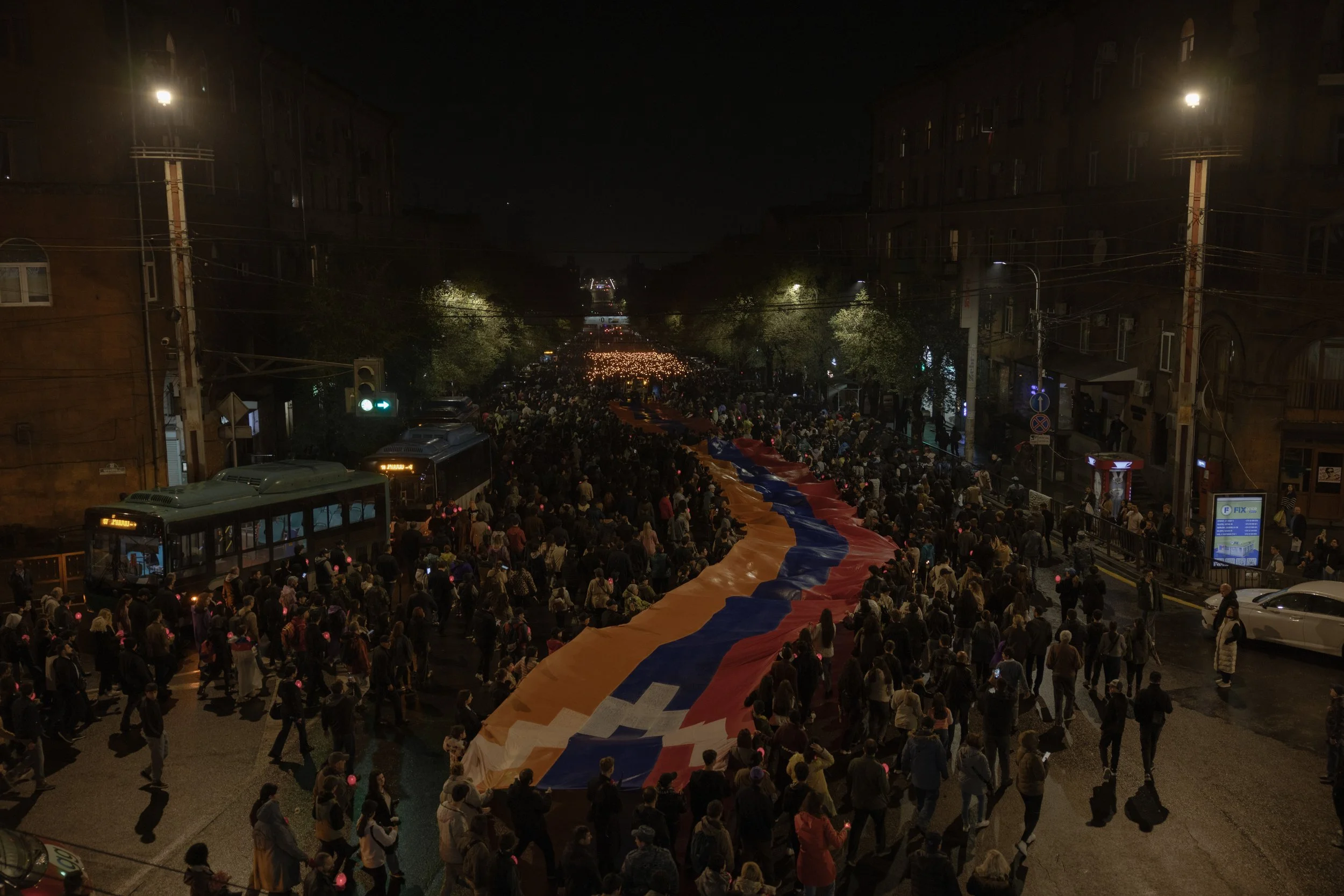 Thousands of Armenians march to the Tsitsernakaberd Genocide Memorial in Yerevan, Armenia carrying the flag of Nagorno‑Karabakh (Artsakh) during the annual torchlight procession on the eve of 110th Genocide Remembrance Day, held amid ongoing tensions along the Armenia–Azerbaijan border on 23 April 2025.