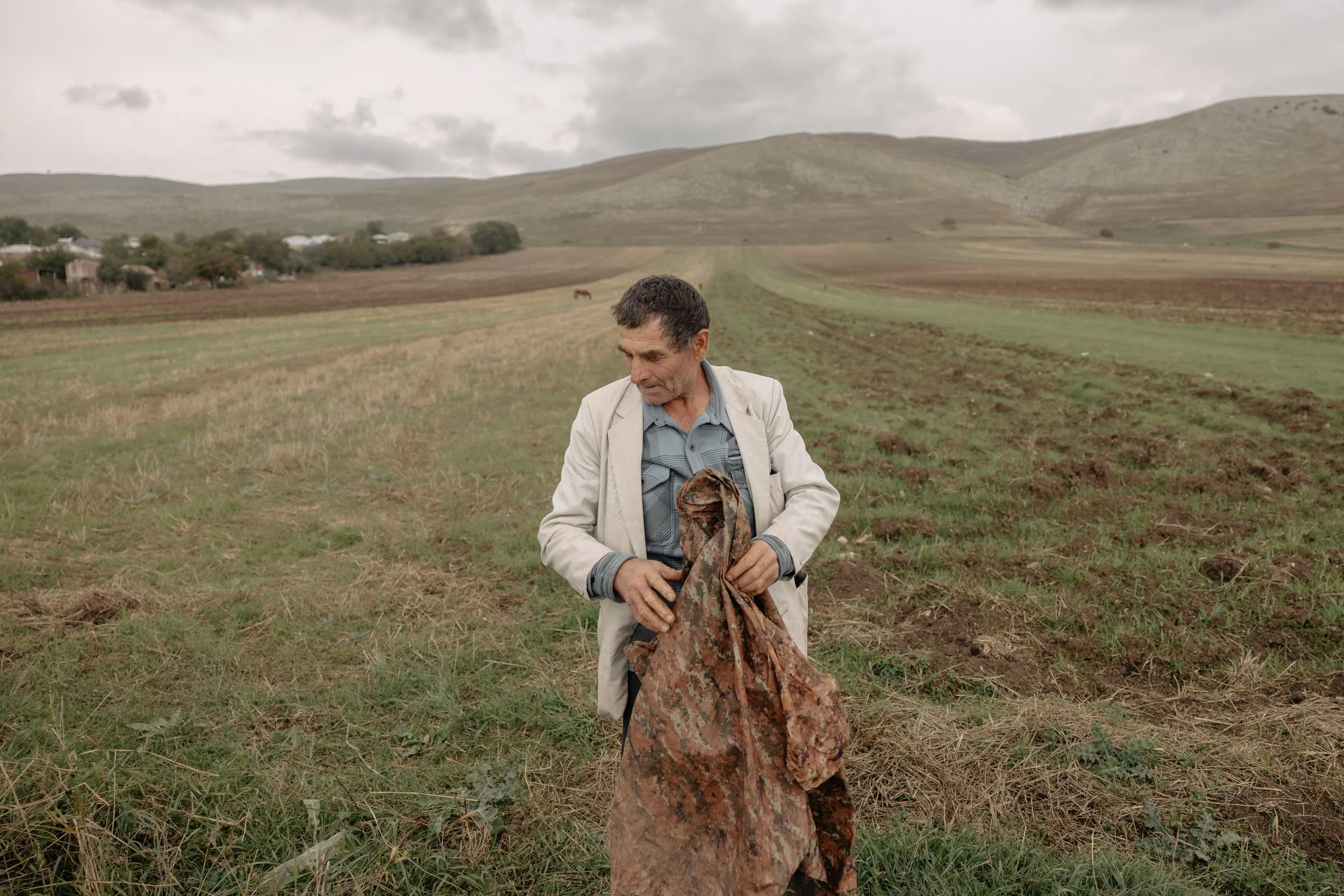 An agricultural worker removes his military jacket in Kornidzor, just kilometers from the border with Azerbaijan on 25 September 2023 after Azerbaijan declared full control over Nagorno-Karabakh, reflecting the uncertainty and shift in military and civilian roles as Armenians confront the collapse of long-standing territorial status and the mass displacement of ethnic Armenian civilians following the lightning Azerbaijani offensive.