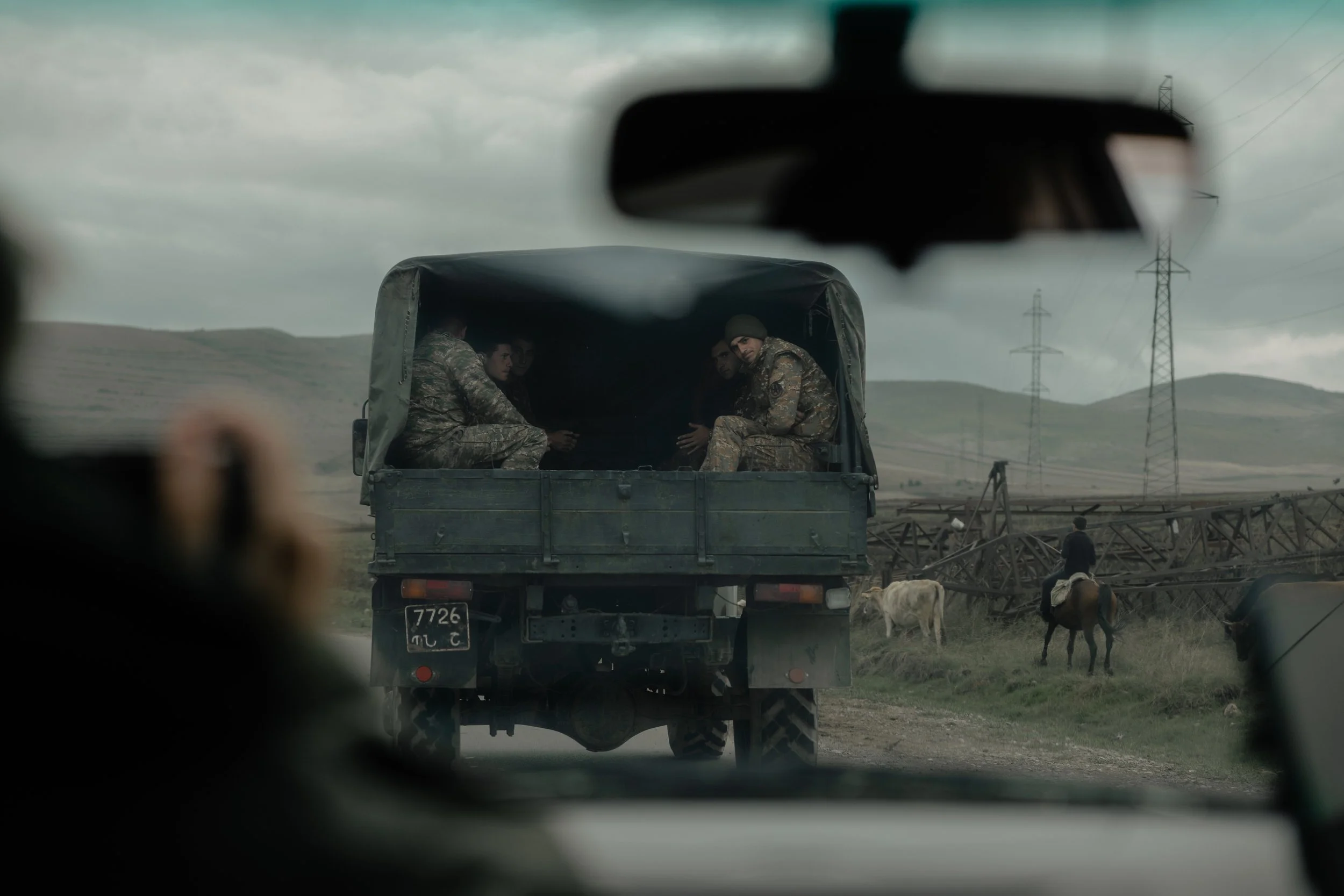 Armenian soldiers travel away from the border with Azerbaijan in Kornidzor, Armenia on 26 September 2023 as ethnic Armenians displaced from Nagorno-Karabakh cross into Armenia following a large-scale Azerbaijani military offensive days earlier, part of a mass exodus that forced more than 100,000 civilians to flee their homes.