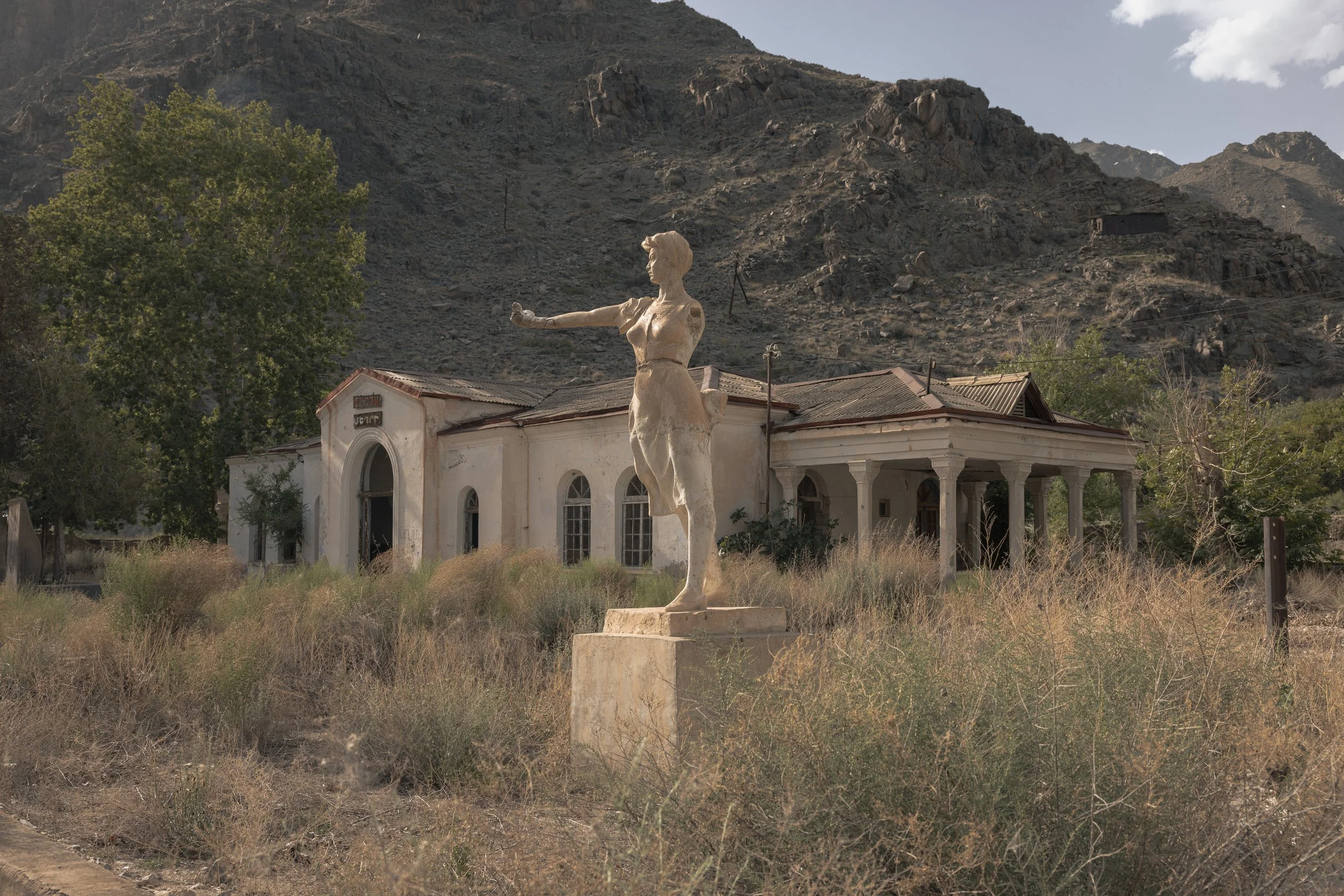 A Soviet-era statue depicting a female figure stands outside the former Meghri railway station in the village of Araksashen, southern Armenia, on May 18, 2025. The station was once a key stop on the Yerevan–Baku railway, a route that linked Armenia and Azerbaijan and formed part of a broader transport corridor connecting Moscow to Tehran. Rail operations ceased in April 1992 as regional conflict and political upheaval severed cross-border transport, and the Meghri section of the line was later dismantled entirely between 2010 and 2011. Little is documented about the statue’s origin, though its dynamic pose reflects the monumental public art of the Soviet period, often associated with themes of labor, resilience, and collective identity. Today, the statue overlooks the abandoned station grounds, a reminder of a former era of regional connectivity now overshadowed by unresolved tensions and ongoing debate surrounding the proposed Zangezur Corridor.