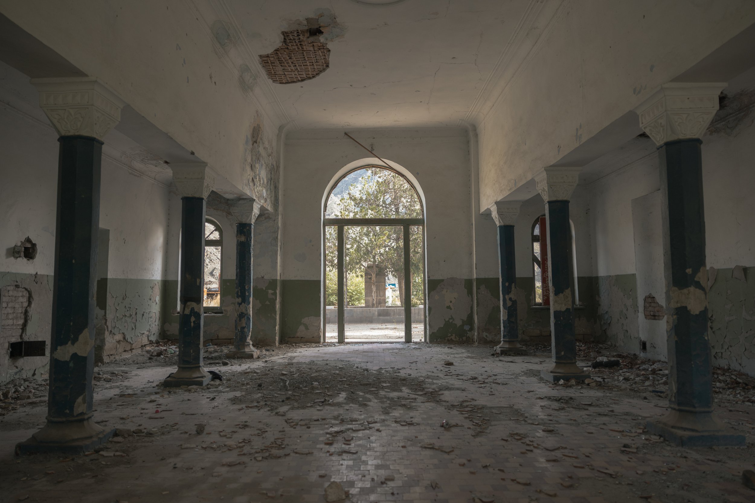 Sunlight streams through shattered windows inside the abandoned Meghri railway station in Armenia on May 18, 2025. Once a key stop on the Yerevan–Baku rail line, the station has sat empty since 1992.